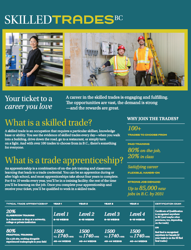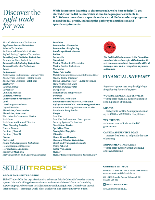 The Industry Training Authority (ITA) manages over one hundred apprenticeship and Red Seal trades. To explore these trades, visit the ITA website.