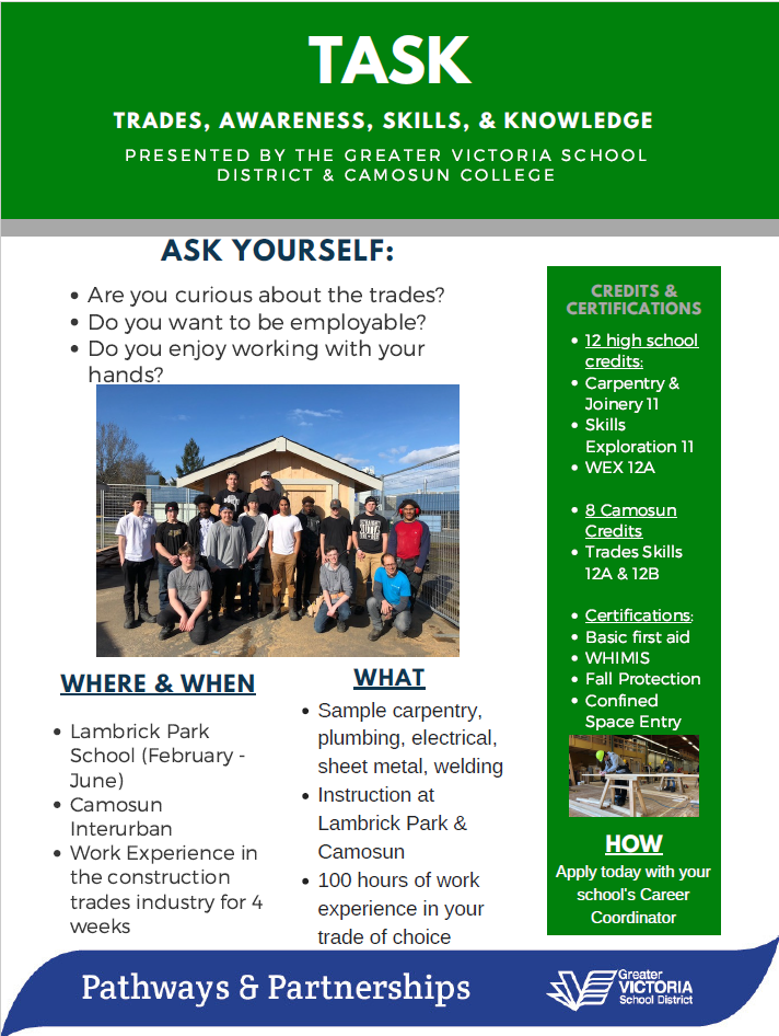 The TASK program allows students to experience hands-on, project-based learning within a high school, college and job site setting. Through classroom and shop instruction, and work experience placements, students can earn 24 credits. The TASK programs run every second semester at Lambrick Park Secondary.
